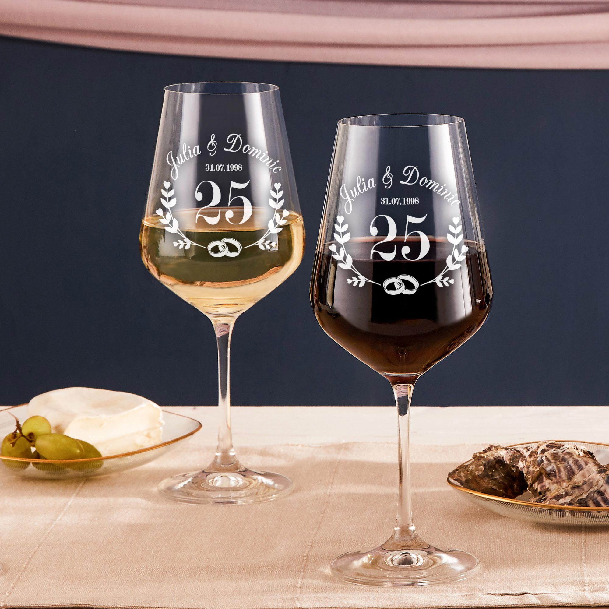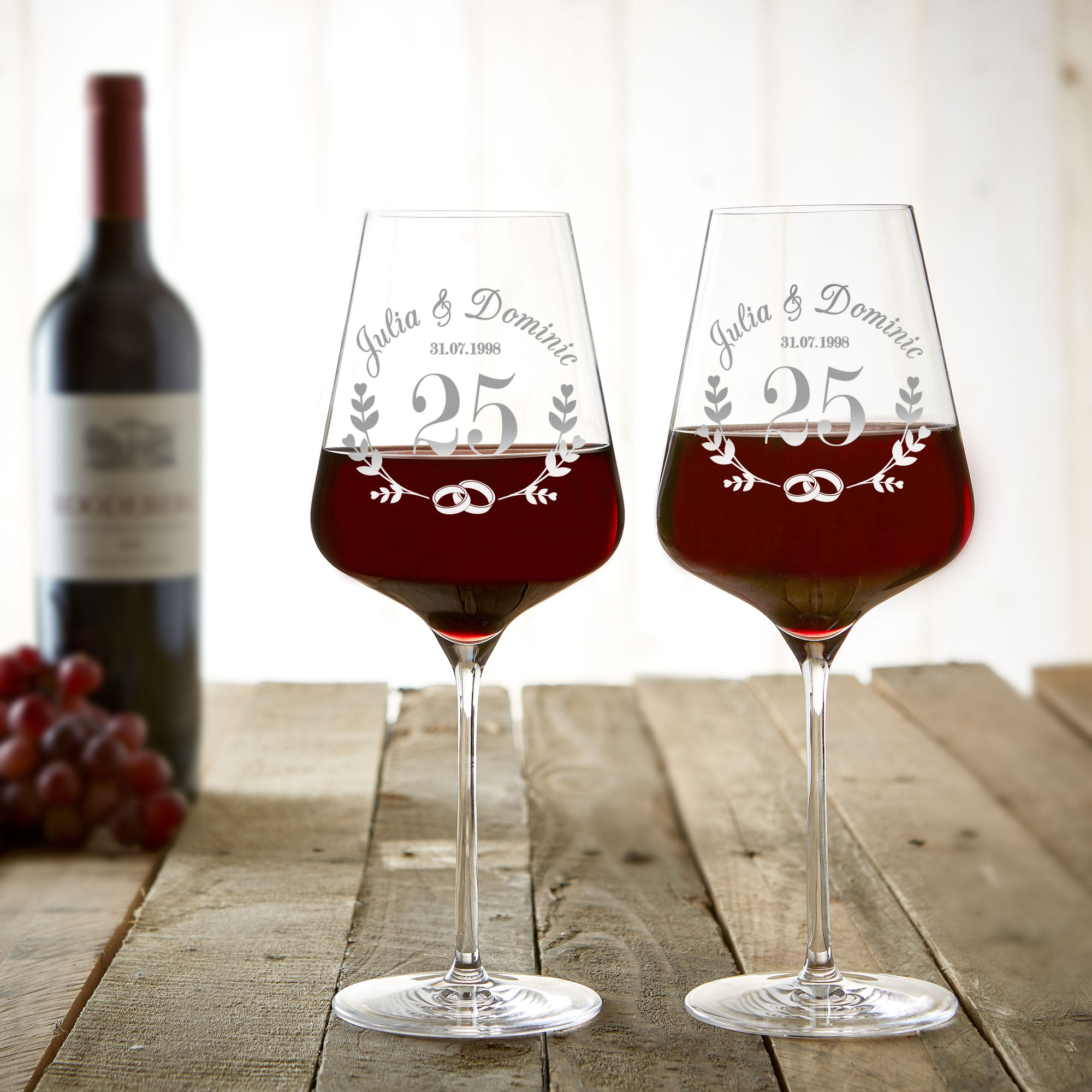 Auf den Weingläsern wird ein passendes Silberhochzeit-Motiv mit einer großen "25" verewigt. Zudem werden zwei individuelle Namen und ein Wunschdatum graviert, um ein absolutes Highlight zu einem unvergesslichen Anlass entstehen zu lassen. Das personalisierte Weingläser-Set beeindruckt dank hochwertiger Verarbeitung und sorgt für Wein Hochgenuss vom Allerfeinsten. Gemeinsam anstoßen und genießen!