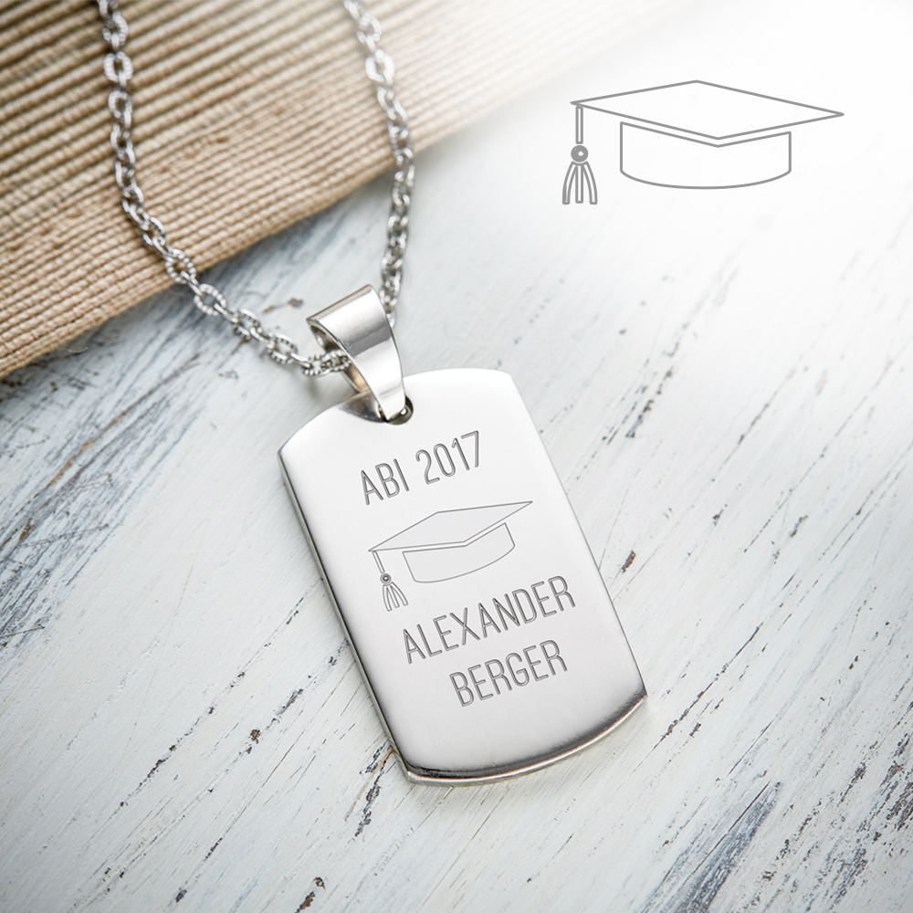 Die Erinnerung an dieses einmalige Erlebnis soll dem frischgebackenen Schulabsolventen selbstverständlich noch lange im Gedächtnis bleiben. Der Edelstahlanhänger dieses coolen Schmuckgeschenkes wird hierfür eigens nach Deinen Wünschen mit dem Jahr des Abiturs und dem Namen des erfolgreichen Schulabgängers graviert. Zusätzlich ziert ein symbolischer Doktorhut das metallene Medaillon. Army Dog Tag Ketten erfreuen sich bereits seit Längerem größter Beliebtheit und sind sehr gefragt. Somit wird der glückliche Abiturient nicht nur bei jedem Blick in den Spiegel an seinen großen Erfolg erinnert, sondern auch jeder Betrachter des edlen Schmuckstücks weiß sofort, aus welchem Holz der Besitzer geschnitzt ist. Schenke einem Freund, Bekannten oder Familienmitglied, das jüngst sein Abitur erfolgreich bestanden hat, dieses einmalige Geschenk mit persönlicher Note und lasse es ihn oder sie mit Stolz tragen - denn das Abitur besteht man nur einmal im Leben!