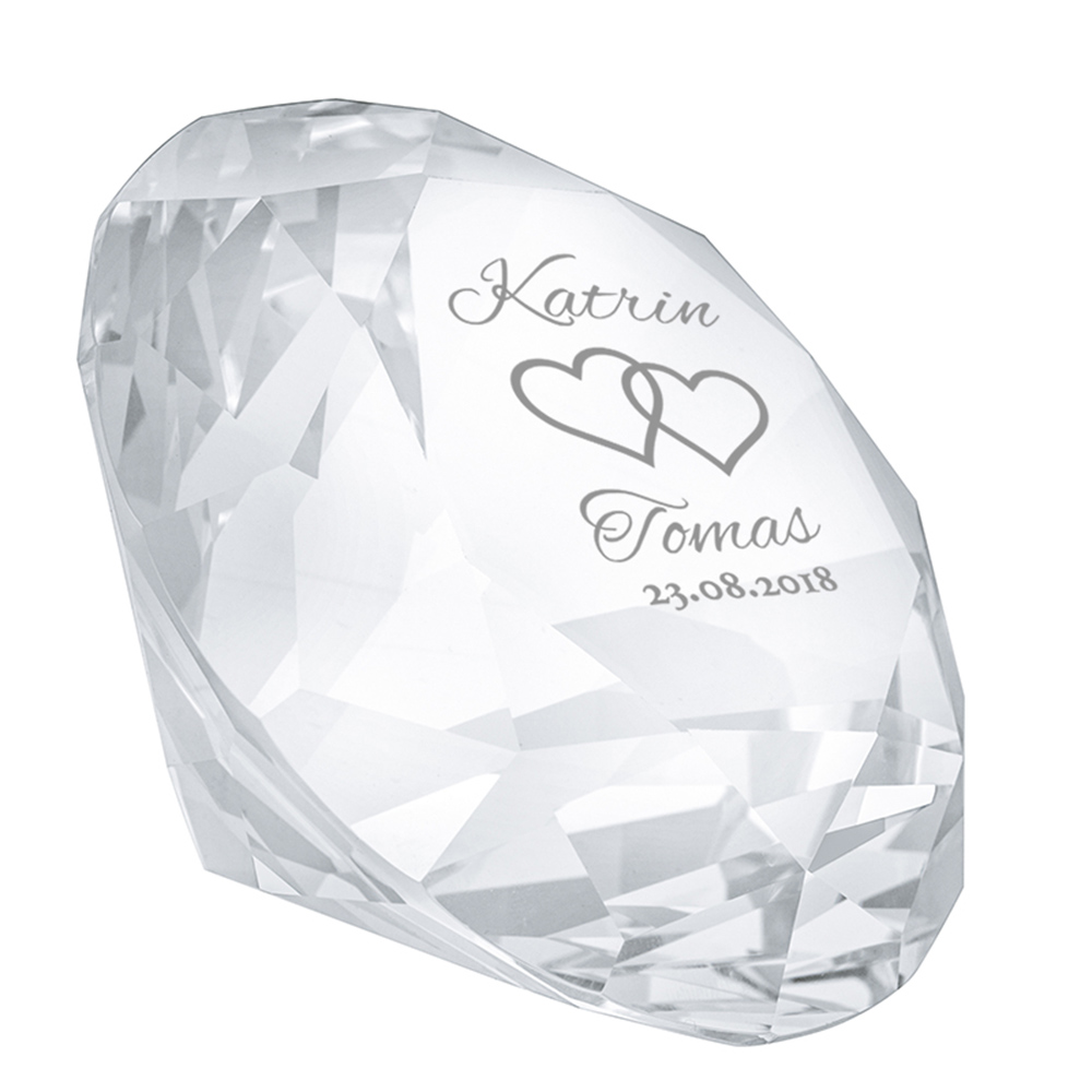 Nun mag sich manch einer fragen: Warum gerade dieser Diamant Glaskristall? Es ist nicht einfach nur ein Diamant-Kristall aus Glas. Tatsächlich handelt es sich um ein symbolisches und sehr individuelles Geschenk, welches man als Brautpaar immer wieder gerne anschaut. Schließlich sind dort die Namen der Braut und des Bräutigams, das Hochzeitsdatum sowie wahlweise sich kreuzende Ringe oder Herzen eingraviert! So erinnert man sich jedes Mal, wenn man als ein Brautpaar den Blick auf diesen Diamanten schweifen lässt, an diesen ganz besonderen Tag, als man sich das Ja-Wort gegeben hat!