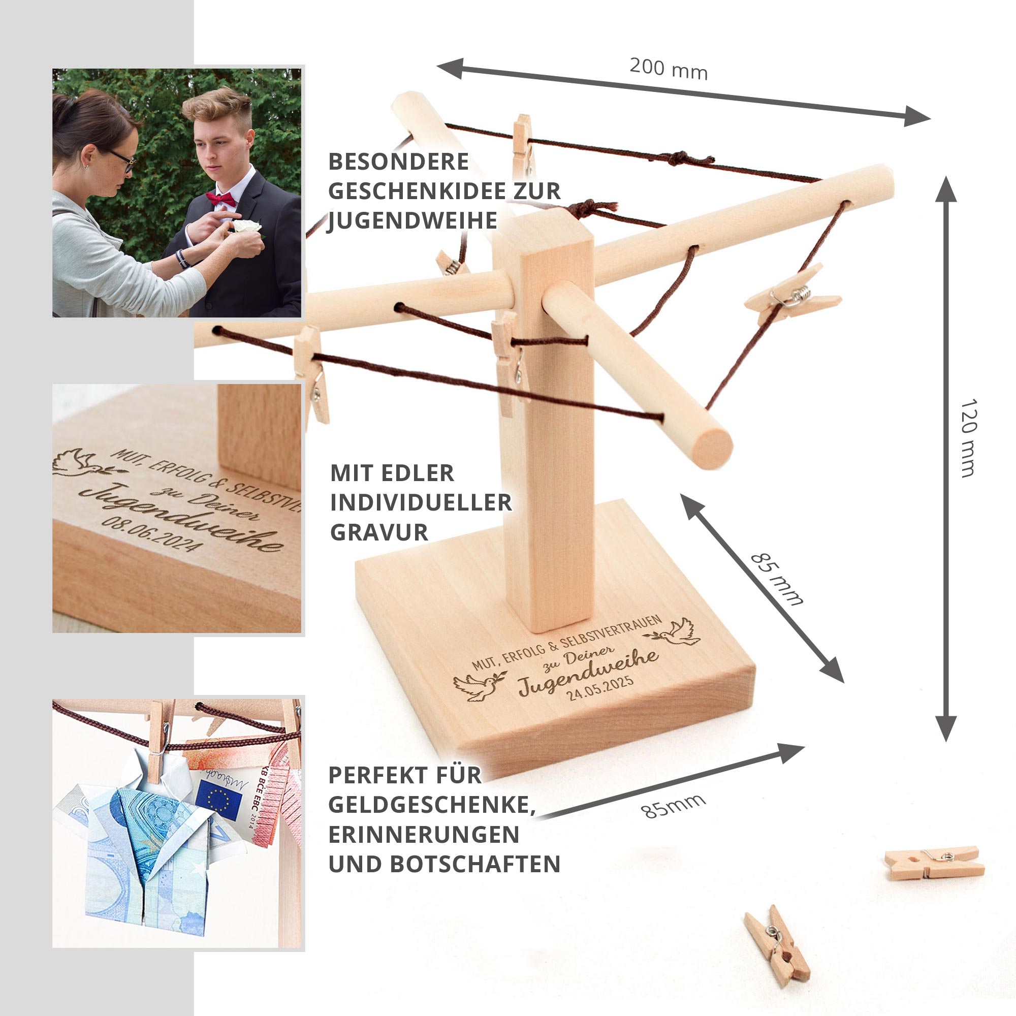 - Geld Wäschespinne mit Gravur "Mut, Erfolg & Selbstvertrauen zur Jugendweihe" im Sockel