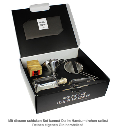 Ab sofort bist Du nicht mehr auf den 08/15 Gin aus dem Supermarkt angewisen, sondern kannst Dir mit dem exklusiven Gin Baukasten Deinen eigenen Gin im trauten Eigenheim kreieren. Dabei ist nicht nur guter Geschmack gefragt, sondern auch viel Kreativität und Leidenschaft! Mit diesem ausgefallenen Gin Set wird Dein nächster Gin Drink zum Premiumgenuss - versprochen! Also: Lasse mit Freunden die Gin Herstellung beginnen!