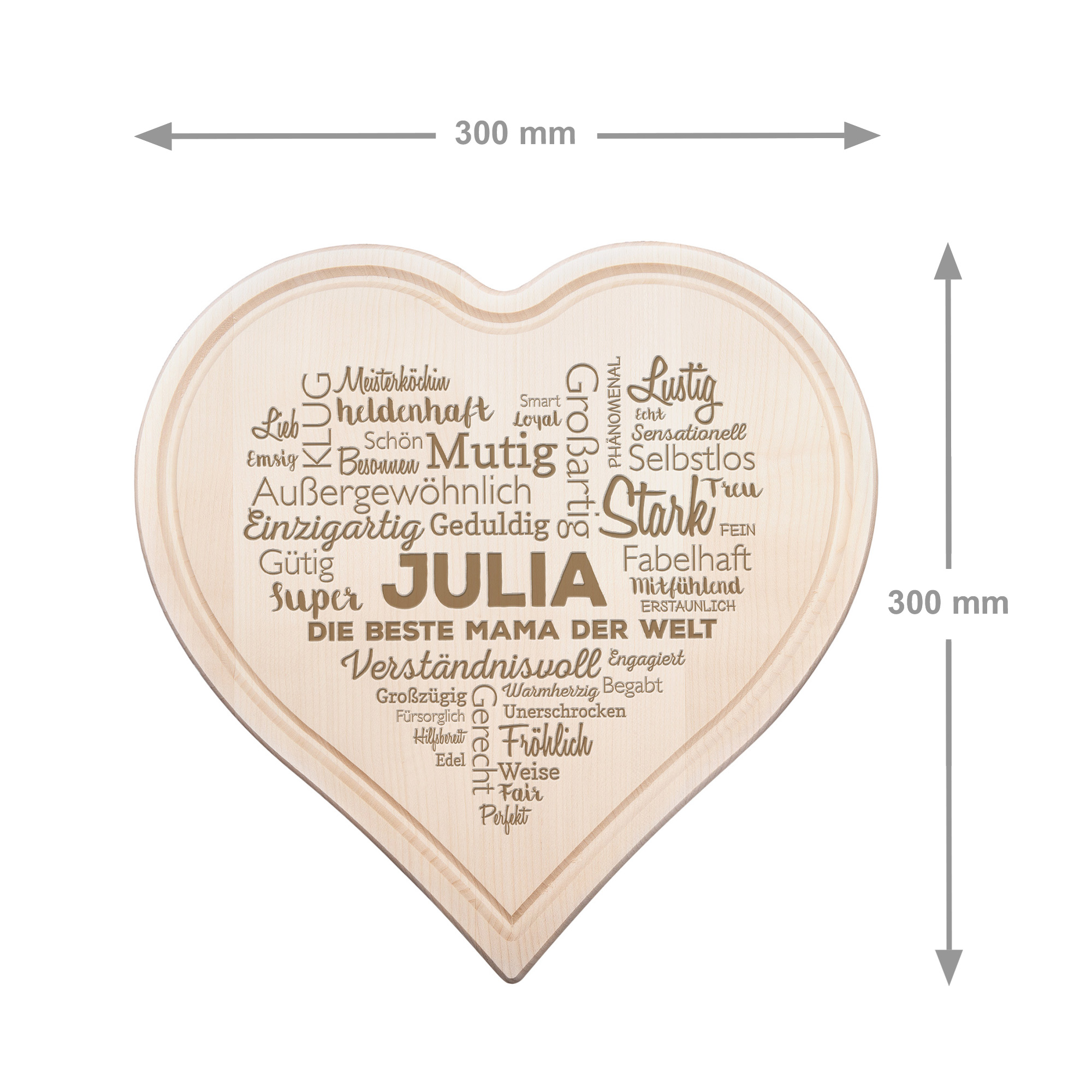 Als absolutes Highlight wird in der Mitte der Wortherz Gravur der Name Deiner Mama mit dem Schriftzug "Die beste Mama der Welt" graviert. Somit entsteht ein personalisiertes Kochbrett, das neben seiner genialen Funktionalität auch optisch zu überzeugen weiß. Die integrierte Saftrille sorgt für ein sauberes Schnitterlebnis und vollendet das Holzherz zu einem wahren Allrounder für die Küche.