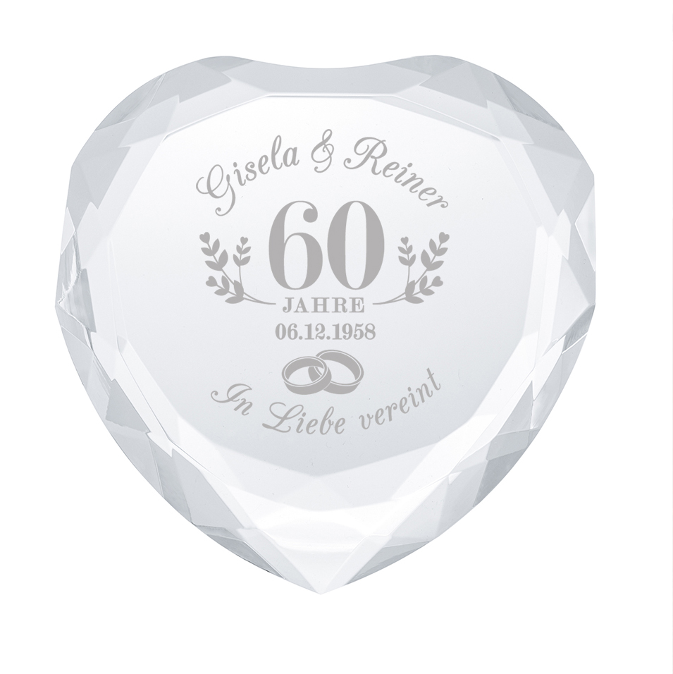 Fein geschliffenes Glasherz mit Gravur zur diamantenen Hochzeit