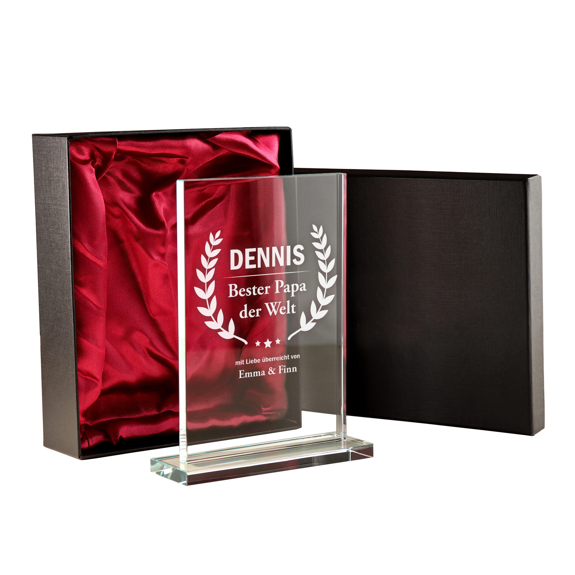 Sei es eine notfallbedingte Reparatur, der persönliche Fahrdienst oder die unvermeidlichen Flachwitze, auf Deinen Vater ist stets Verlass. Du bist ihm so unendlich dankbar für alles, doch Dir fehlen einfach die richtigen Worte, um ihm zu sagen, wie sehr Du ihn schätzt. Du brauchst also ein besonderes Geschenk zum Vatertag, der all das zum Ausdruck bringt. Wir empfehlen ganz uneingeschränkt den Personalisierten Glaspokal - Auszeichnung für Besten Papa, mit dem Du und Deine Geschwister Euren Vater zum weltbesten Dad küren könnt - ein Geschenk, das mehr als Tausend Worte sagt!Ob als Jubiläumsgeschenk oder als Dankeschön Geschenk für Papa, der personalisierte Pokal aus Glas wird Deinen Vater richtig rühren. Schließlich wird man nicht jeden Tag zum besten Papa der Welt ernannt! Die im minimalistischen Design gehaltene Glastrophäe wird individuell nach Deinen Wünschen gefertigt. Dafür musst Du uns lediglich den Namen Deines Vaters sowie die Namen aller Schenkenden mitteilen und schon werden Deine Wünsche dank Lasergravur auf die Oberfläche des Pokals übertragen. Zusammen mit der schwarzen Geschenkbox als Verpackung ist der Pokal mit Gravur fertig zum Verschenken - ein würdiges Präsent für einen besonderen Menschen!