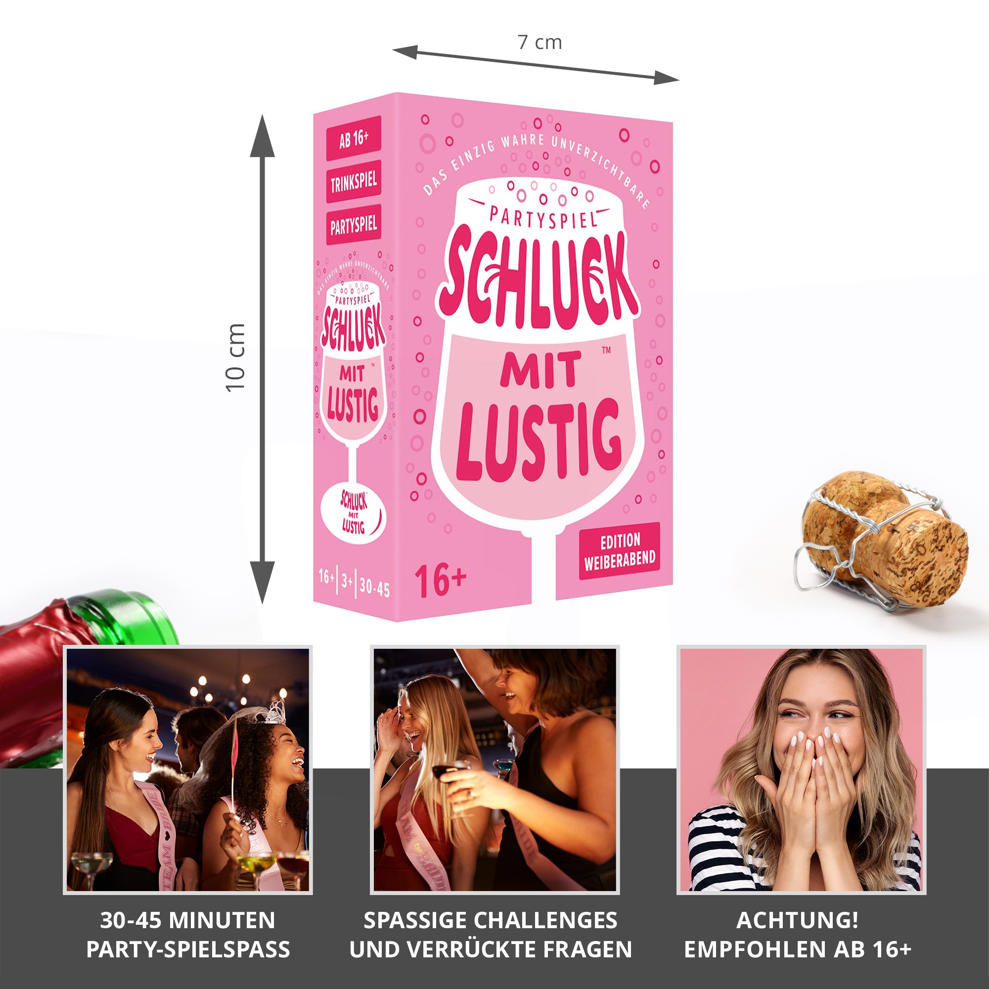 Dabei eignet sich das Drinking Game in der "Weiberabend" Edition besonders für Frauen ab 16 Jahren, die den Mädelsabend auf richtige Art und Weise einläuten wollen. Erlebe mit Deinen Freundinnen verschiedenste Herausforderungen zum Vorglühen und verbringt einen geselligen Abend in bester Gesellschaft. Ein lustiges Trinkspiel, das als Mitbringsel zur Party immer gern gesehen ist und für aufregende Spielrunden bei außergewöhnlichem Spaßfaktor sorgt.