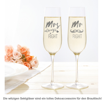 Die modernen Sektgläser mit extra großem Fassungsvermögen werden professionell von uns graviert. Das Glas des Bräutigams wird mit dem Schriftzug "Mr Right" und einem Moustache-Motiv versehen, während das Sektglas für die Braut passend dazu als Gag mit der Schrift "Mrs Always Right" und kleinen Herzsymbolen aufgewertet wird. Denn so ist es nun einmal: Sie hat ihren Mr. Right gefunden und er muss fortan damit leben, dass sie immer Recht hat... So erhalten Ehefrau und Ehemann jeweils ein eigenes Glas, das sie nicht nur am Tag der Hochzeit, sondern auch darüber hinaus als witziges und bleibendes Andenken begleiten wird. Es ist beispielsweise eine schöne Idee, an jedem Hochzeitstag mit diesen Gläsern auf die gemeinsamen Jahre anzustoßen. Doch auch als Geschenk zur silbernen, goldenen oder auch diamantenen Hochzeit sind diese Gläser eine geniale Geschenkidee. Ganz egal, ob Du das Set einem befreundeten Paar zur Hochzeit, Deinen Eltern zur Silberhochzeit oder Deiner Frau als kleines lustiges Geschenk zum Hochzeitstag überreichen möchtest, wir wünschen auf jeden Fall viel Spaß beim Verschenken und sagen: "Prost!".