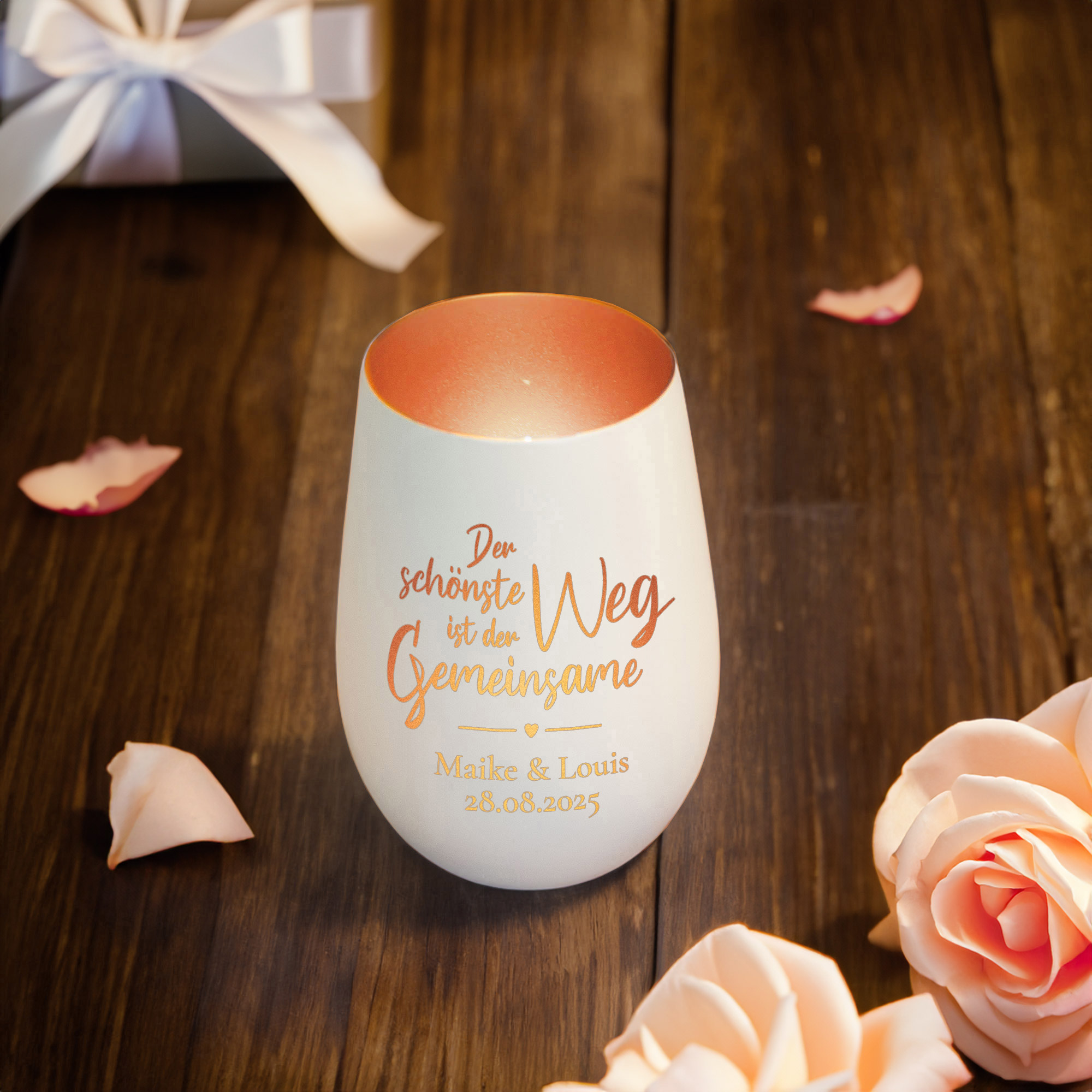 Weißes Windlicht mit Gravur Gemeinsamer Weg - Bronze