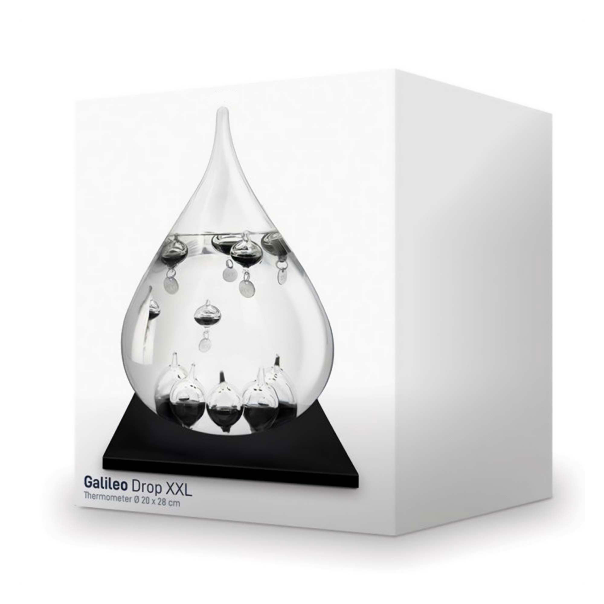 Dieses XXL Galileo Thermometer im eleganten Tropfen-Design vereint antike Wissenschaft und modernes, minimalistisches Design im monochromen Look. Inspiriert von Galileo Galileis Entdeckung zur Temperaturmessung mit Flüssigkeitsdichte, zeigt dieses Thermometer die Temperatur auf faszinierende Weise an: Die neun Glaskugeln mit schwarzer Flüssigkeit steigen oder sinken je nach Raumtemperatur und sind ein echter Hingucker in jeder Umgebung. Ob im Wohnzimmer, Büro oder im Arbeitszimmer – das Galileo Thermometer beeindruckt als stilvolles Deko-Element und als funktionales Temperaturmessgerät gleichzeitig.