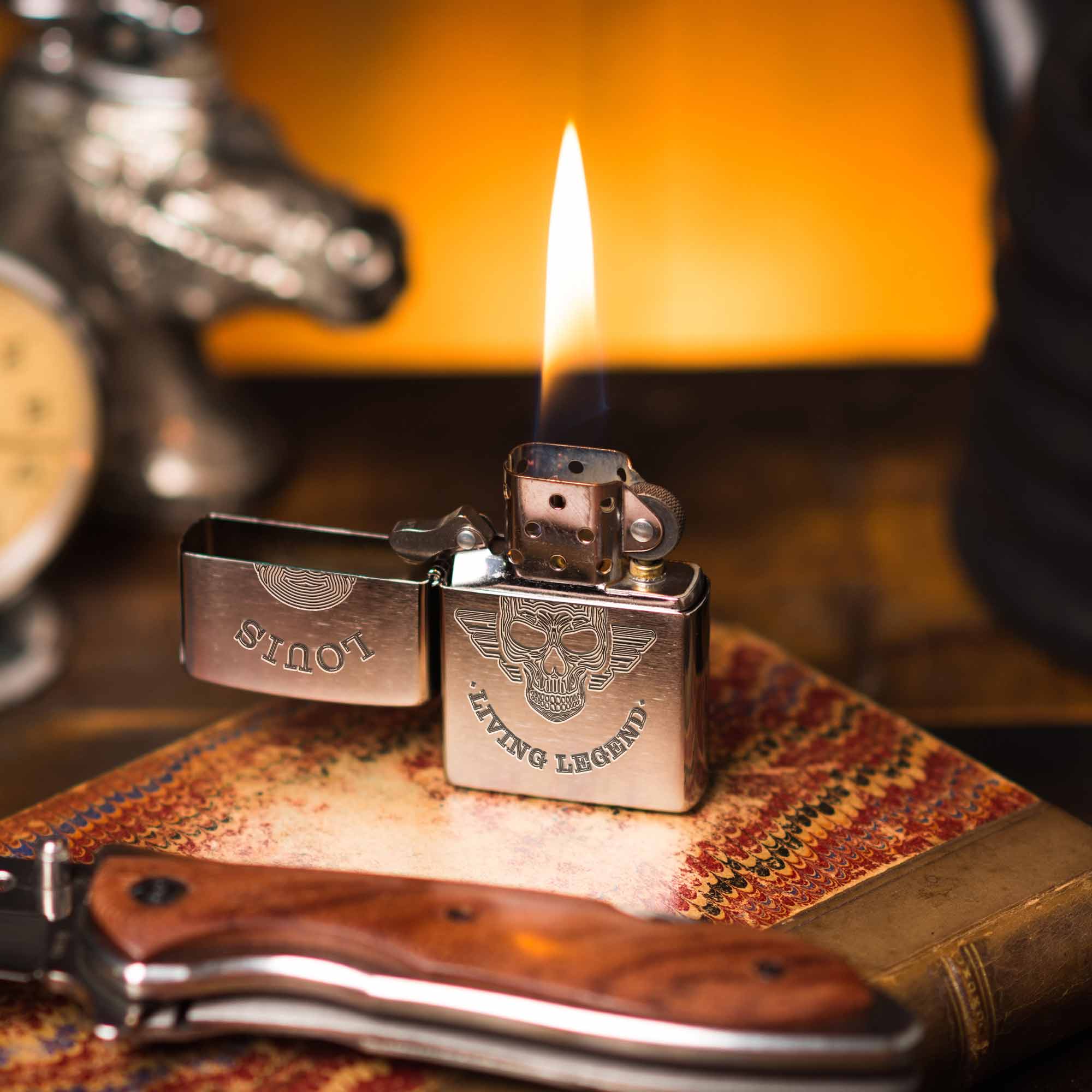 Auf der Oberfläche des Zigarrenfeuerzeug wird ein Totenkopf Motiv mit Schriftzug "Living Legend" verewigt. Ergänzt um die individuelle Gravur eines Namens entsteht ein persönliches Geschenk zu feierlichen Anlässen. Überrasche Biker, Rock-Fans oder Raucher mit dem außergewöhnlichen Feuerzeug mit Gravur und sorge für Begeisterung. Das Sturmfeuerzeug ist ein treuer Alltagsbegleiter für Freunde oder Familie.